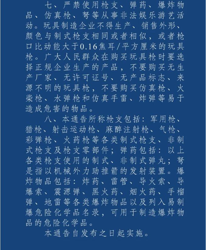 七、嚴(yán)禁使用槍支、彈藥、爆炸物品、仿真槍、弩等從事非法娛樂(lè)游藝活動(dòng)。玩具制造企業(yè)不得生產(chǎn)、銷售外形、顏色與制式槍支相同或者相似,或者槍口比動(dòng)能大于0.16焦耳/平方厘米的玩具槍。廣大人民群眾在購(gòu)買玩具槍時(shí)要選擇正規(guī)企業(yè)生產(chǎn)的產(chǎn)品,不要購(gòu)買無(wú)生產(chǎn)廠家、無(wú)許可證號(hào)、無(wú)產(chǎn)品標(biāo)志、來(lái)源不明的玩具槍,不要購(gòu)買仿真槍、火柴槍、水彈槍和仿真手雷、炸彈等易于造成危害的物品。