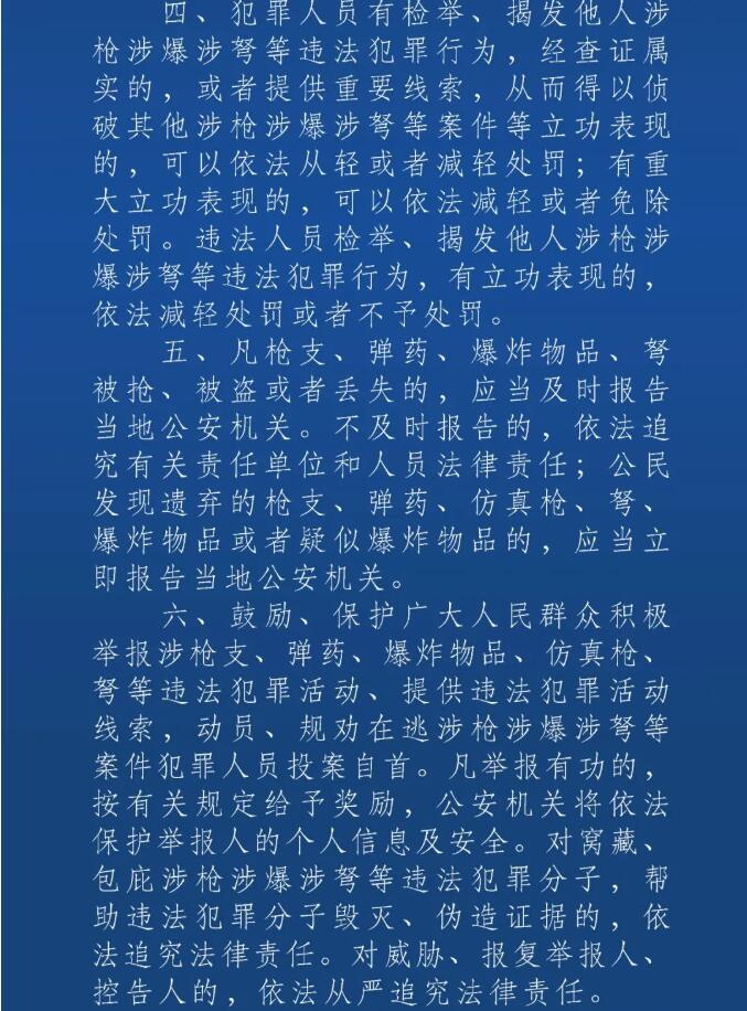 二、凡違反上述規(guī)定的,必須立即停止違法犯罪行為并投案自首,將非法槍支、彈藥、爆炸物品、仿真槍、弩上交當(dāng)?shù)毓矙C(jī)關(guān)。